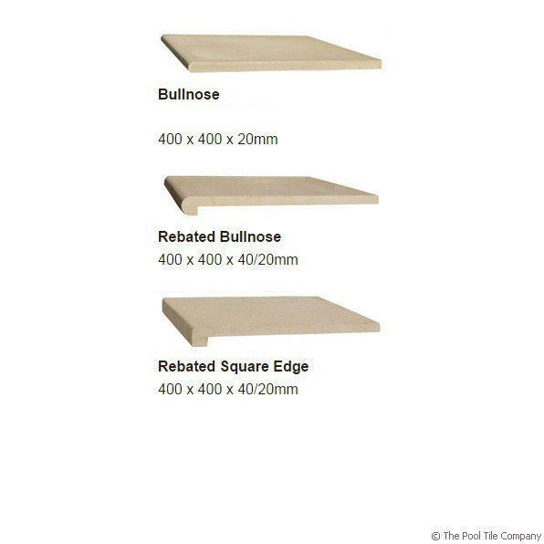 Stocked Matching Pieces | Coping Profiles - Bullnose, Rebated Bullnose, and Rebated Square edge, Skimmer Lids. Availability: Standard sizes listed are usually available ex-stock. |