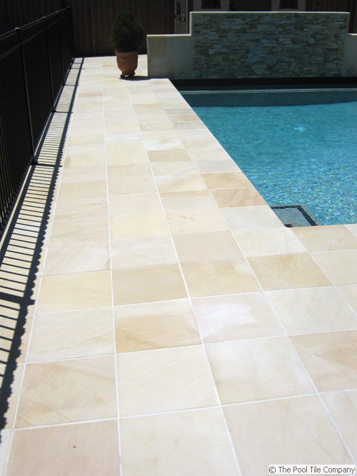 Maintenance | Himalayan Sandstone is hard but porous making it more susceptible to mould and marking. It is very cool underfoot compared to dark colours. There is minimal thickness variation from tile to tile. Seal with a penetrating, consolidating sealer to make cleaning easier and reduce the effect of salt attack. Do not use strong acid to clean. When choosing a natural stone coping around your pool, it is imperative to keep your water level at least 75mm from the bottom of the coping edge. This is especially true if you have a salt water pool! If the water is too close to your natural stone, the salt can be drawn up by the sun through the stone causing salt attack. If you don’t have an overflow valve/pipe you need to reduce your water levels manually. In addition to the correct water levels being adhered to, coping pieces should be sealed, within a few weeks of the pool being filled with water, using a ‘consolidating sealer’ and then a ‘penetrating sealer’, as per professional advice and manufacturer recommendations. Click here to learn more about how to care for your natural stone. |