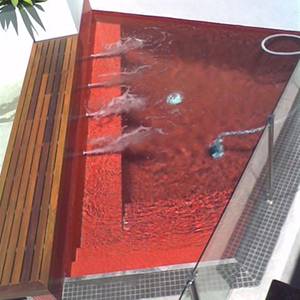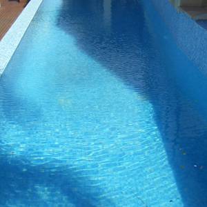of pearl finish applied over the top of each tile. In full sun the light travels through the tile and reveals the base colour, however in the shade or looking from different angles the tiles reflect a rainbow effect which simply brings the pool to life! This finish on this pool really has to be seen to be believed. | |||