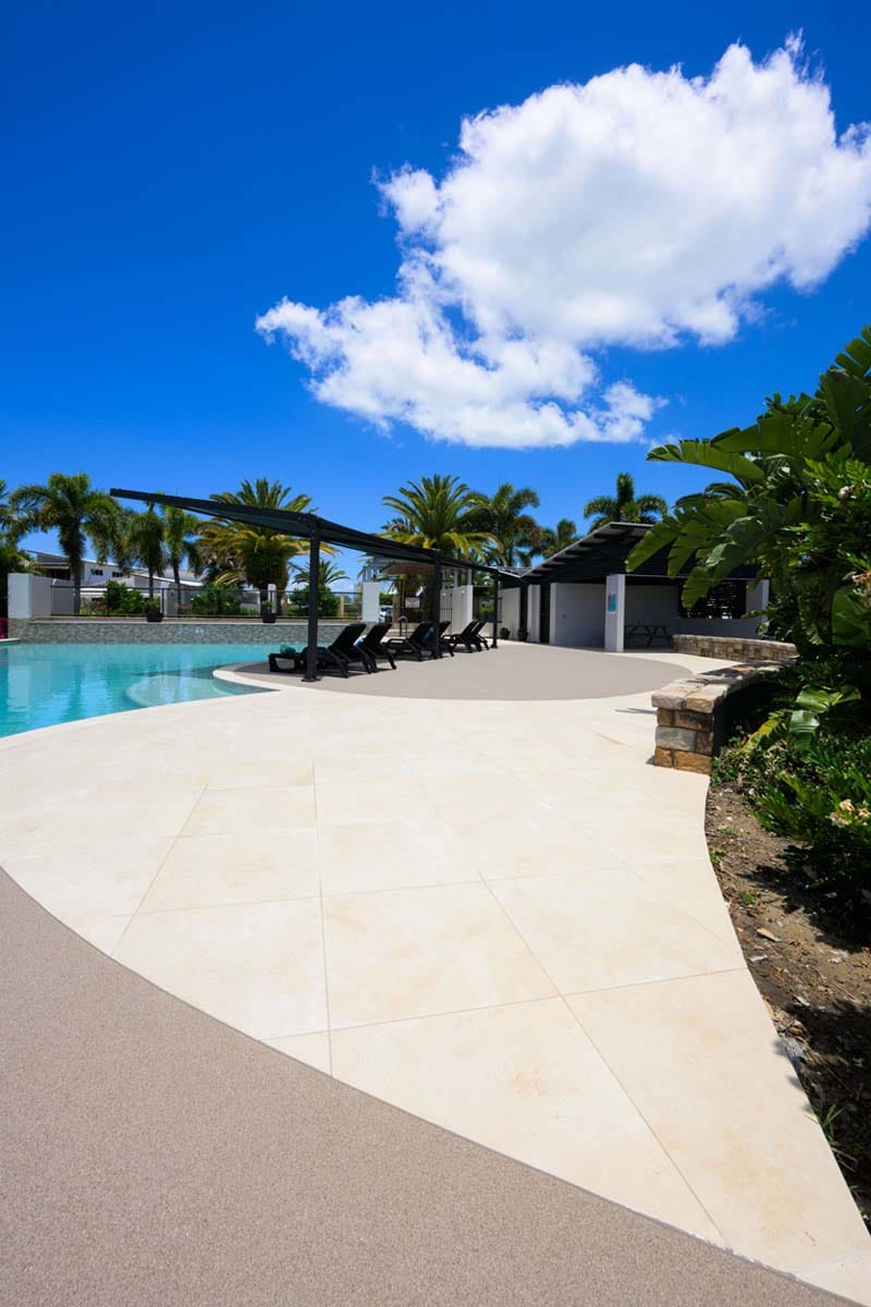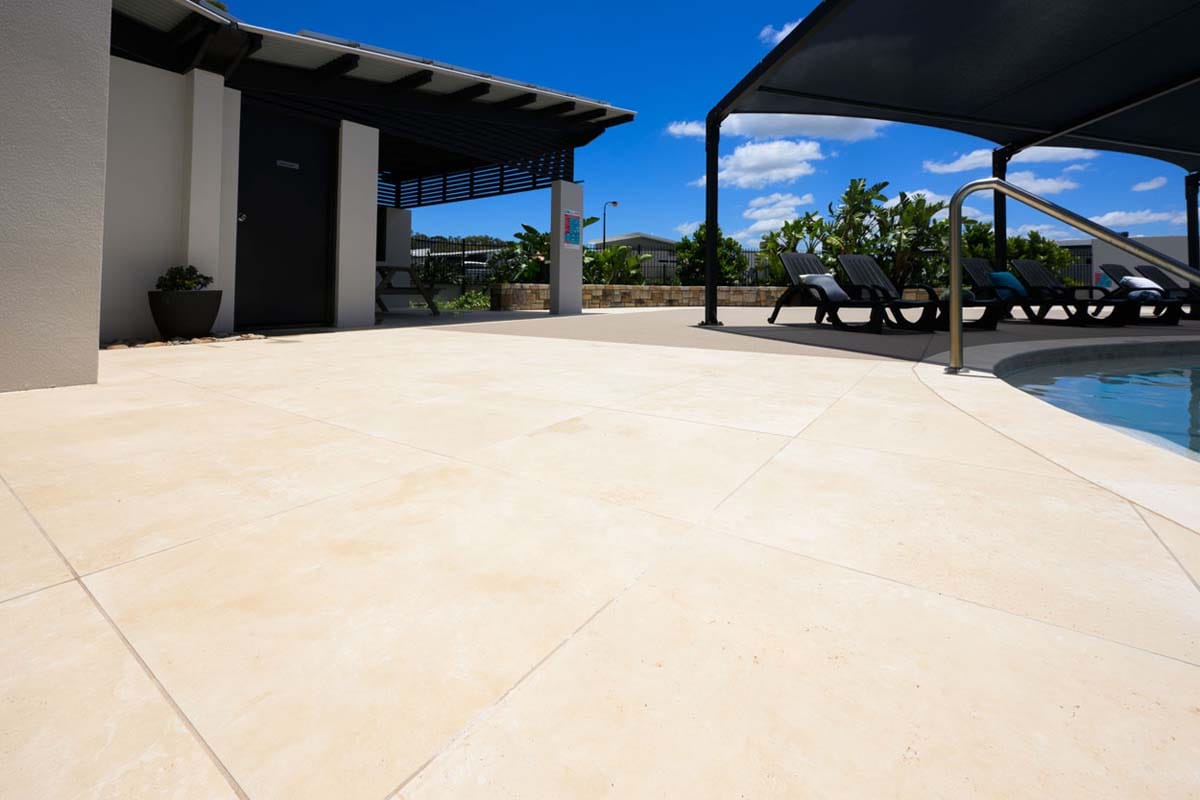 *Calico Travertino GRIPPA® 10mm does not match Calico Travertino 20mm coping and tiles exactly but the two products blend very well. The print and tone is slightly different but is in line with the usual variations that occur in stone and porcelain. We recommend using the Calico Travertino GRIPPA® 10mm on the alfresco areas and then using the Calico Travertino 20mm tiles for surrounds and coping as they have a higher slip rating.