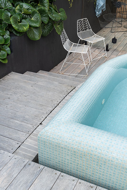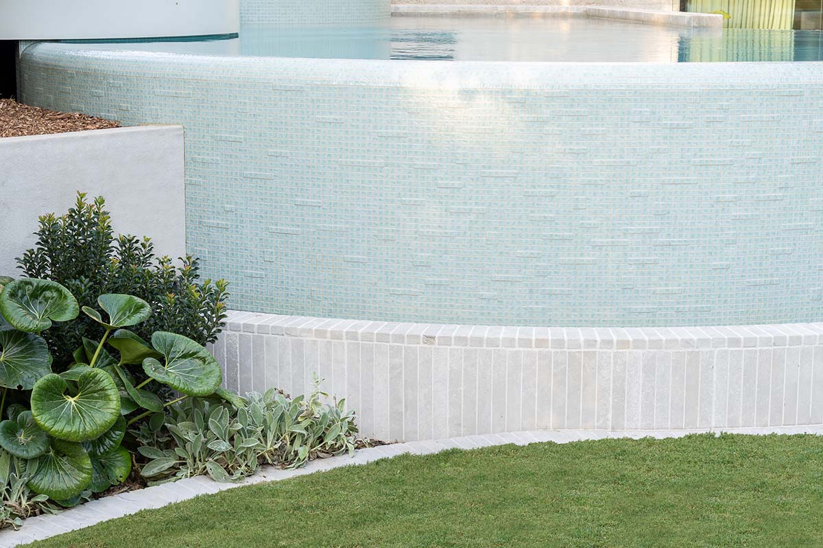Sea Mist Wavy is pale aqua-mint blue-green ceramic pool tile with a smooth textured finish and subtle colour variation, similar in effect to a water-colour painting. A gentle three-dimensional, undulating surface creates a refined, upmarket look.