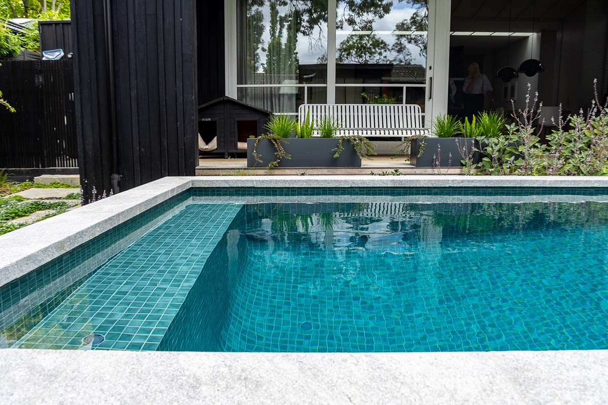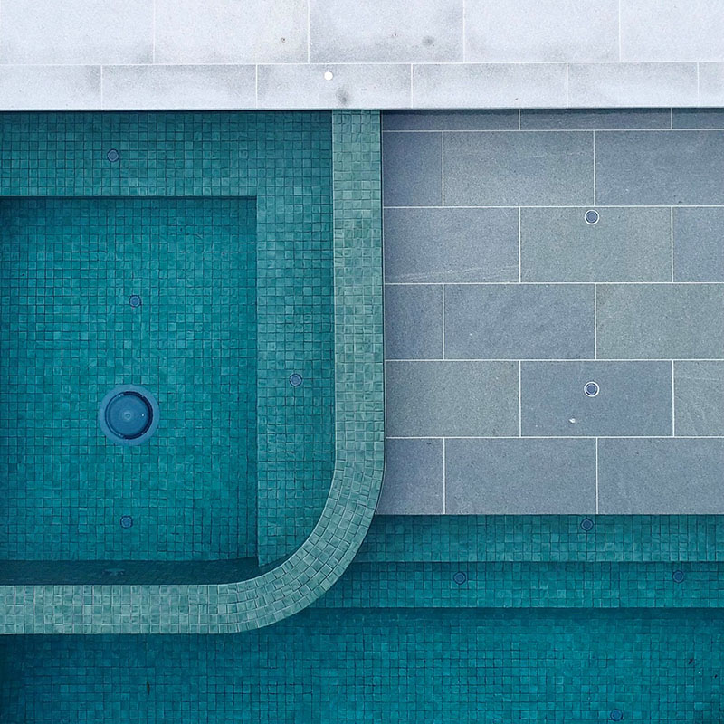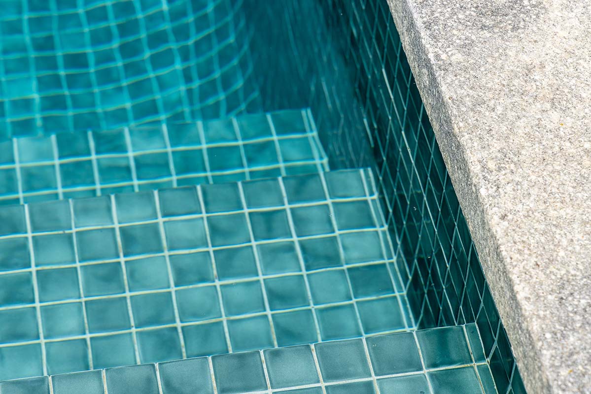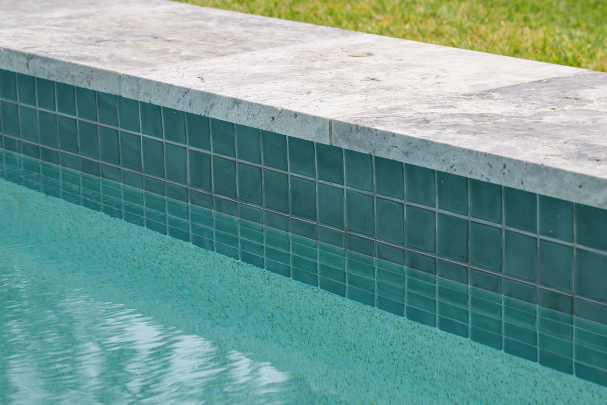 It has a gentle three-dimensional, undulating surface that creates a refined, artistic charm and which looks stunning in a fully tiled pool or on a waterline tile band alongside any shade of green pool water colour.