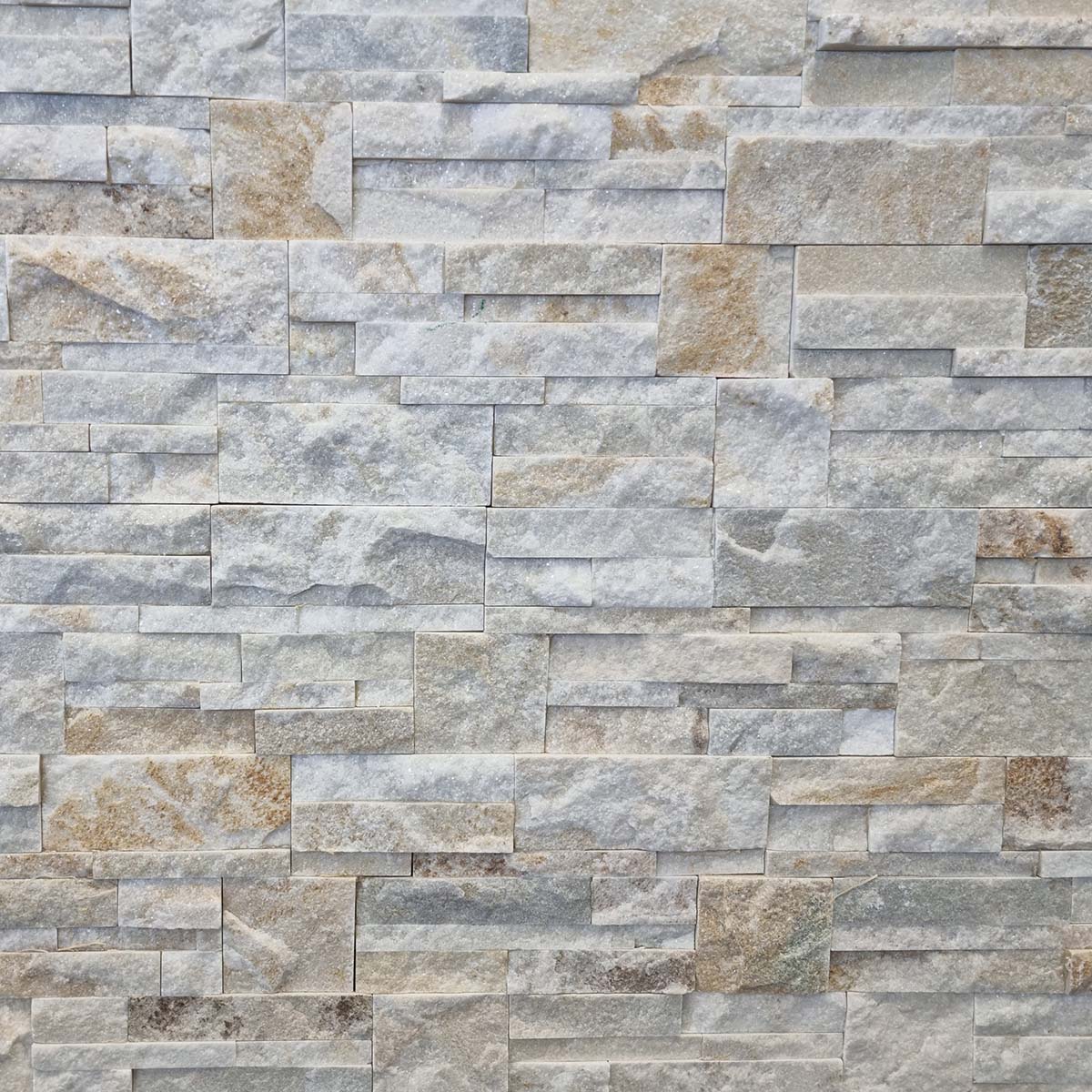 SS315 Contempo Gold – Everything is gold with this white and creamy-white quartzite cladding. Compiled of varying sized and shaped pieces, Contempo Gold is a refined three-dimensional stone cladding product. The added adornment of the gold sparkles which glisten in the light make this stacked stone cladding an adored choice for those seeking a lovely light feature stone.
